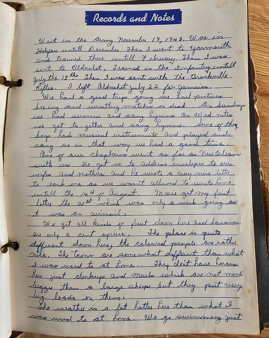 Rifleman Holdright joined his Unit, the Brockville Rifles in late July or early August 1944 in Kingston, Jamaica. The Unit was in Jamaica for garrison duty in defence of Jamaica itself.