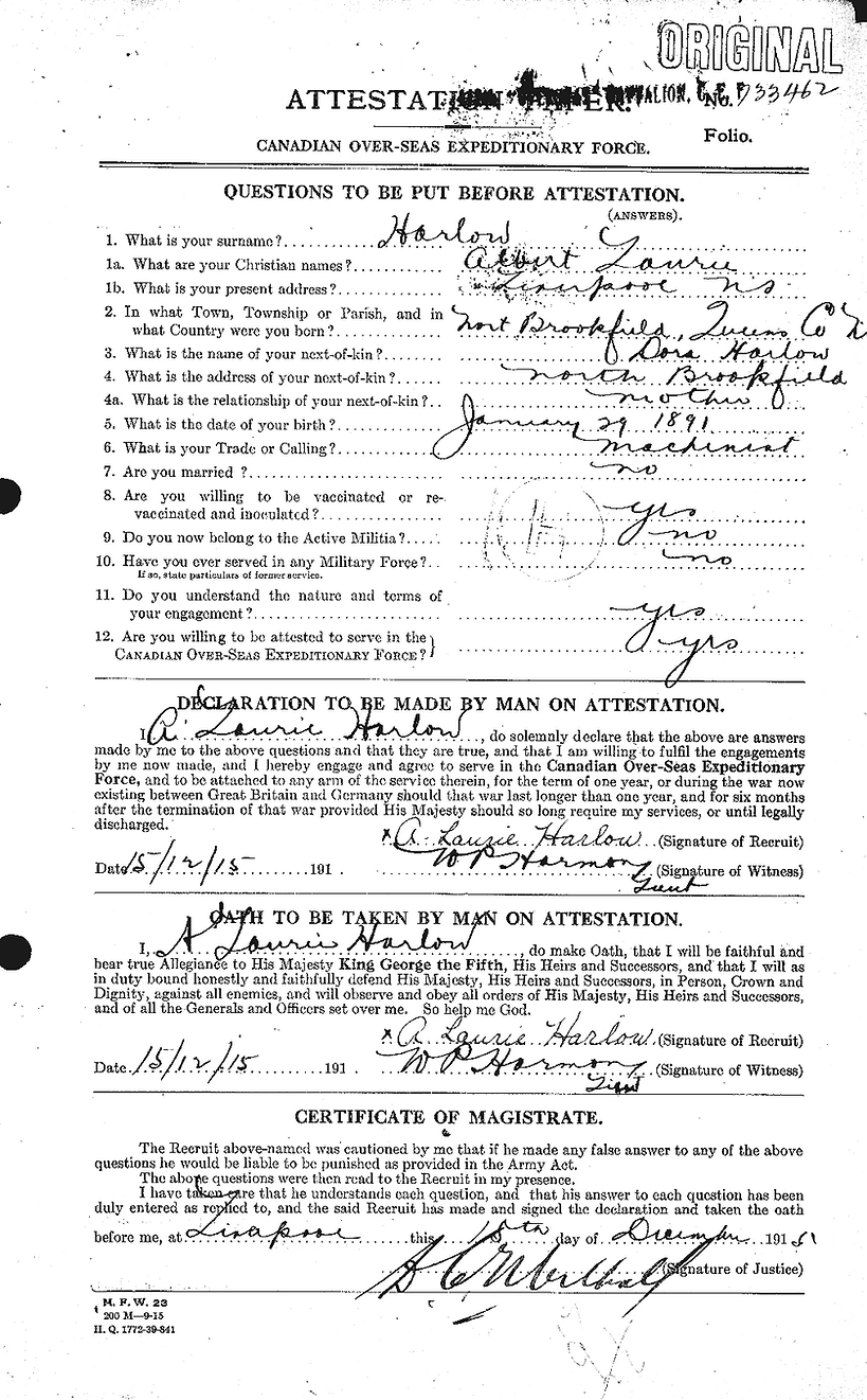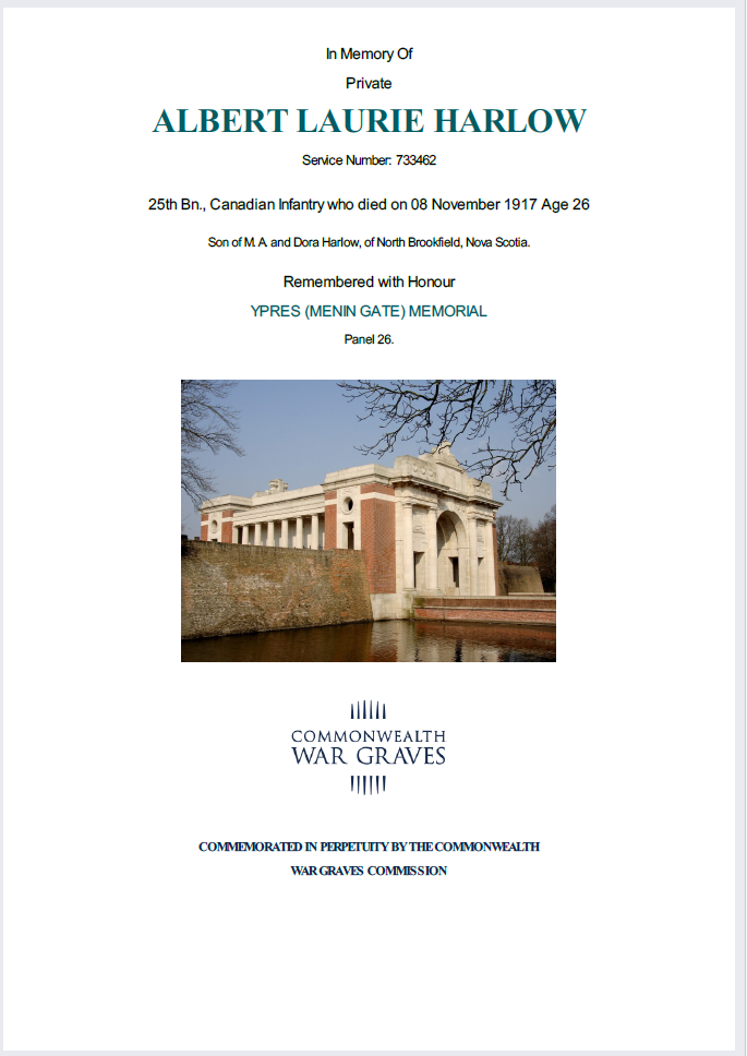 Canadian Virtual War Memorial - https://www.veterans.gc.ca/en/remembrance/memorials/canadian-virtual-war-memorial/detail/1592825?Albert%20Laurie%20Harlow