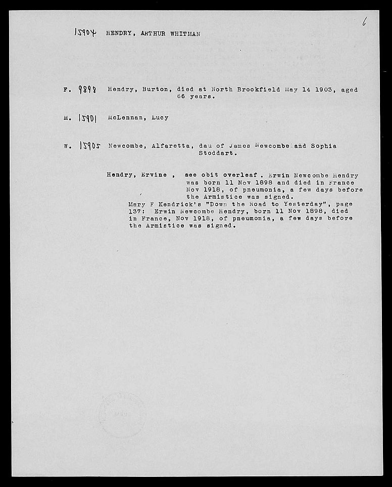 Gunner Ervin Hendry was born the only child of Arthur and Alfaretta (nicknamed Freda) (nee Newcomb) Hendry on November 11th, 1898, in North Brookfield. He listed his occupation as Farmer and attended church as a Baptist.
