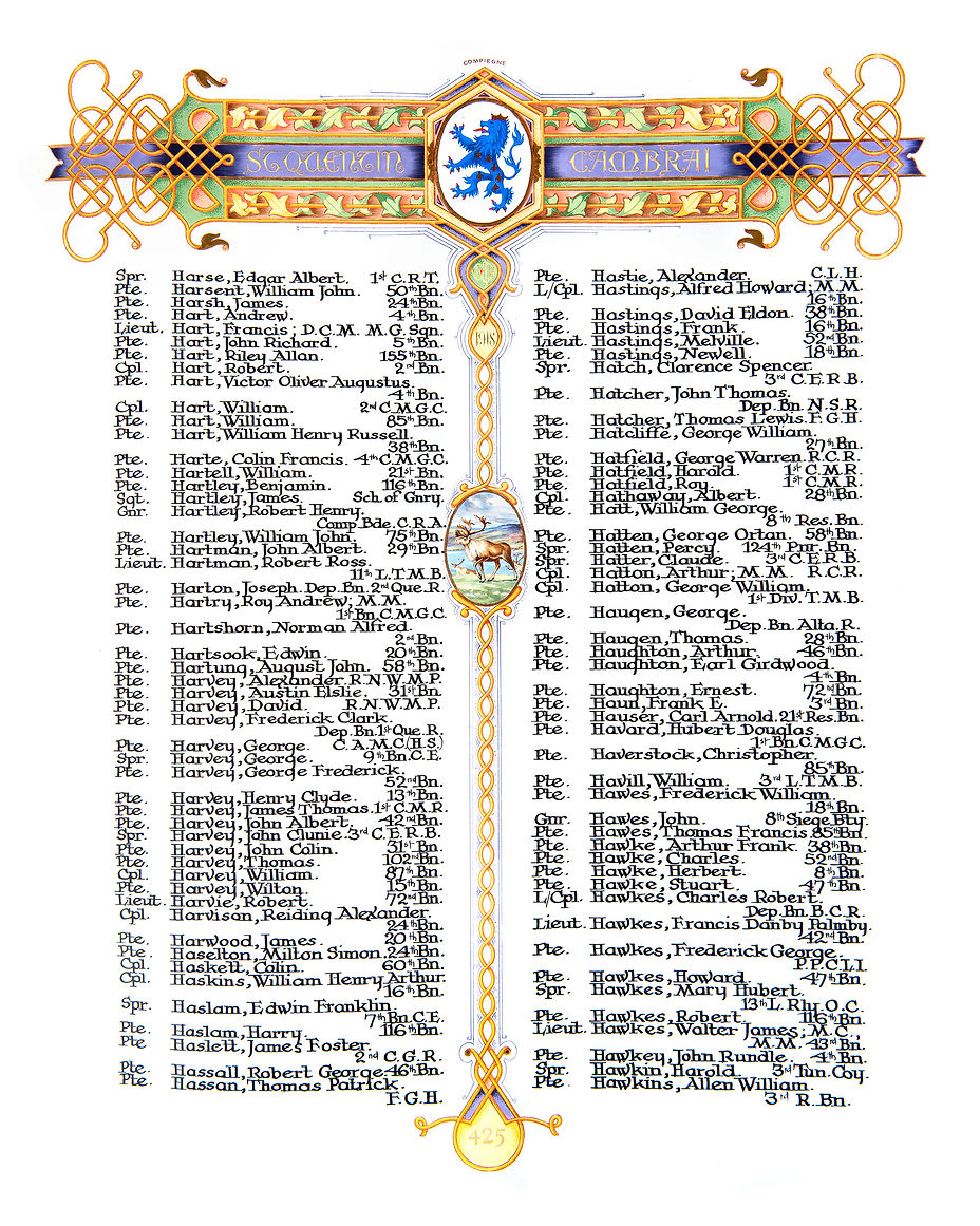 Private Robert Hawkes is commemorated on page 425 of the World War One Book of Remembrance. He is also listed on the Caledonia Cenotaph.