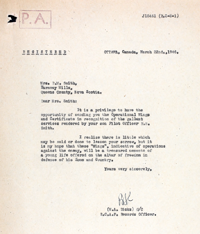 Pilot Officer Smith bequeathed his estate to his mother, Rhoda. Rhoda Smith was awarded the Memorial Cross Medal (also known as the Silver Cross) and received Pilot Officer Smith’s war medals; the 1939-45 Star, the Air Crew Europe Star (for two months operational flying over Europe from Britain), the Defence Medal, the General Service Medal, and the Canadian Volunteer Service Medal (with Clasp). On March 22nd, 1946, Rhoda Smith received her son’s Operational Wings and “Certificate in recognition of the gallant services rendered by your son, Pilot Officer R.B. Smith”.