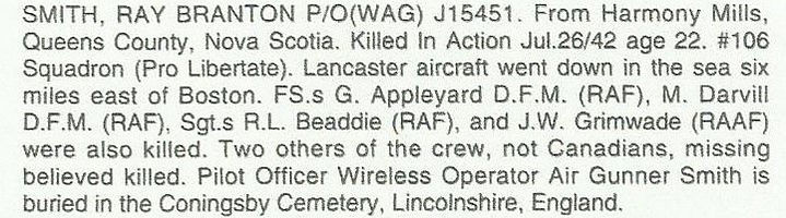 Pilot Officer Ray Branton Smith is commemorated on page 115 of the World War Two Book of Remembrance. He is also listed on the Caledonia Cenotaph and at the Bomber Command Memorial Wall in Nanton, Alberta.