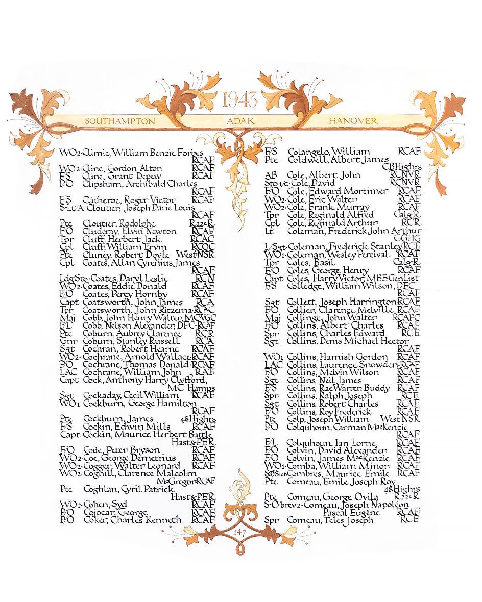 Private Joseph William Colp is commemorated on page 147 of the World War Two Book of Remembrance. He is also listed on the Caledonia Cenotaph.